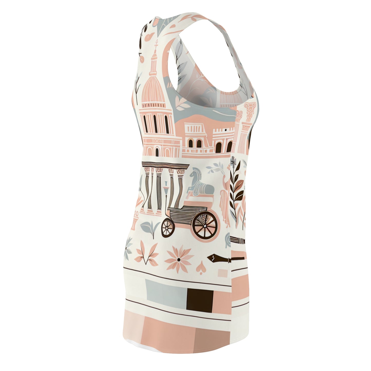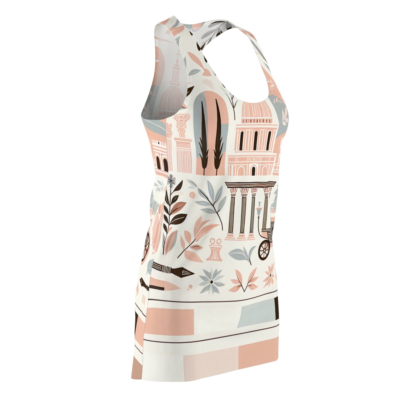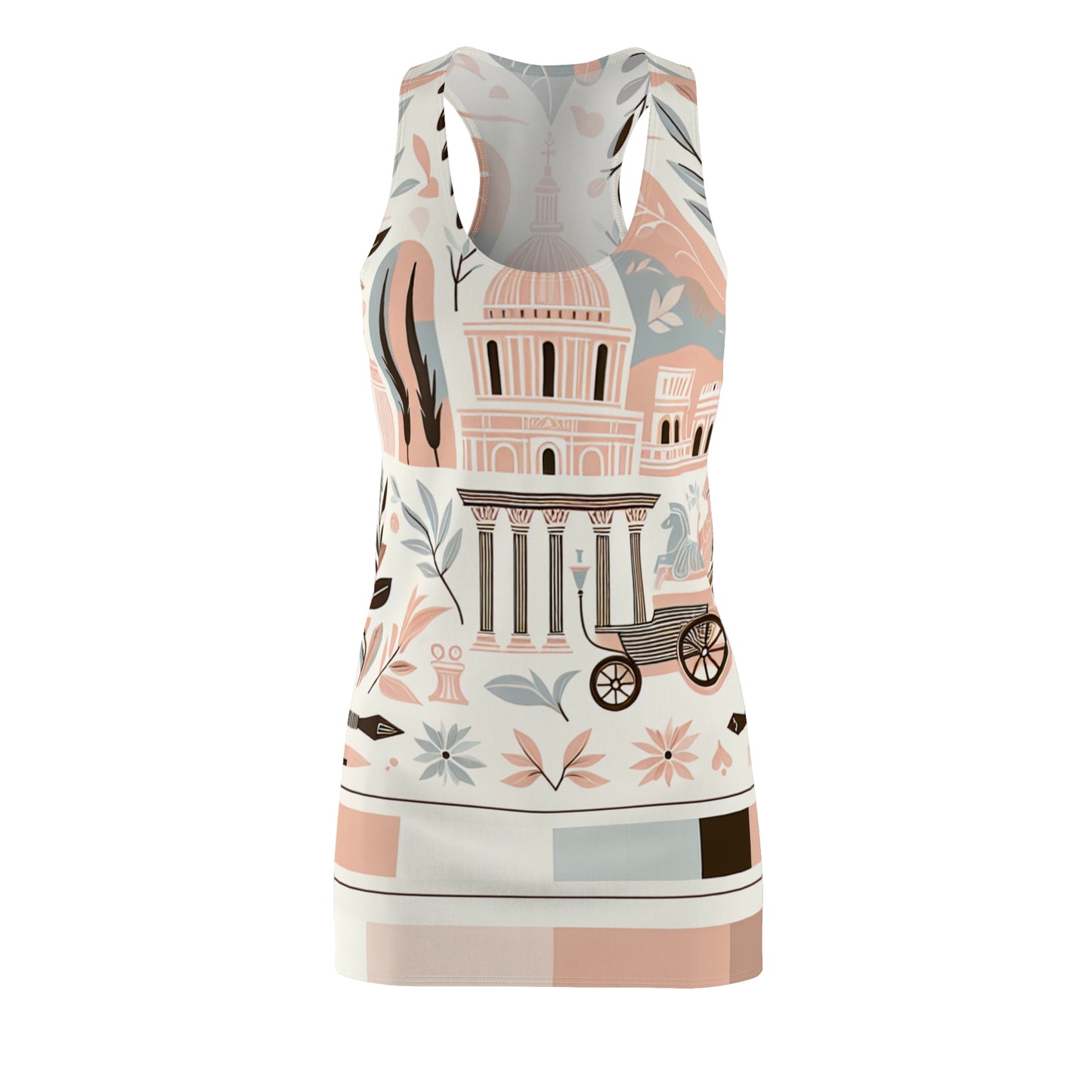 Step into a world of elegance with the Aurelia Vogueworth Rome Dress. This exquisite blush racerback dress seamlessly blends contemporary style with classical inspiration. Drawing from the beauty of ancient Rome, its unique design showcases a stunning array of iconic elements, including magnificent architecture and delicate olive branches. Each detail is thoughtfully crafted to inspire sophistication while maintaining a relaxed, modern aesthetic.
