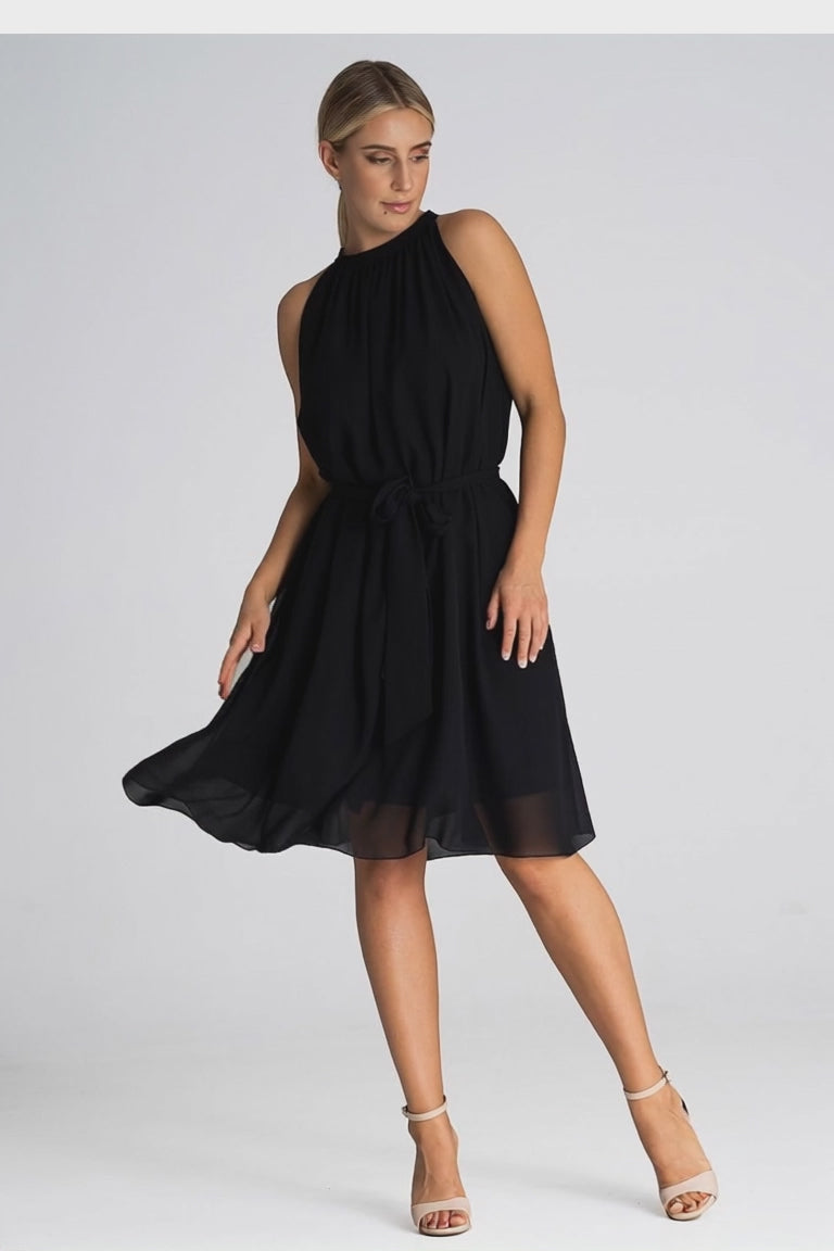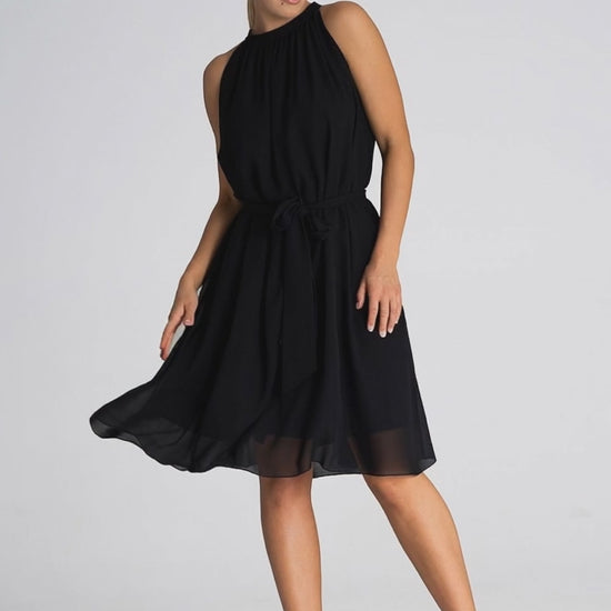 Flattering Figl Evening Dress in Airy Chiffon with Halter Neckline and Unique Sash Design