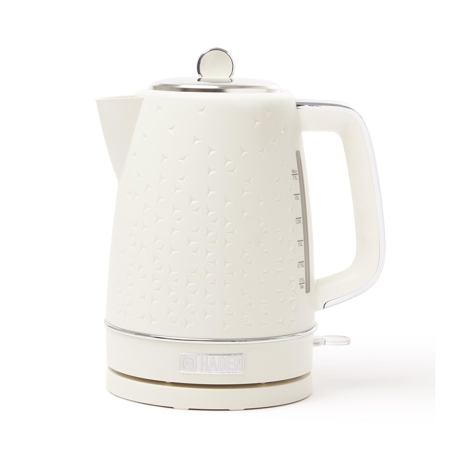Discover the Haden Starbeck White Kettle - where functionality meets style. This 1.7L electric kettle is a marvel of modern kitchen appliances, combining rapid boiling power with energy-efficient operation. Its 3000W concealed element ensures your water is hot in no time, perfect for those busy mornings or a quick, relaxing tea break. But it's not just about quick boiling; it's about doing so quietly. This makes our cordless kettle a must-have for both bustling family kitchens and serene office spaces. The cordless design adds to its convenience, making it as mobile as your lifestyle needs, whether at home or on the go. The kettle's ergonomic handle and simple pull-up lid are designed with your comfort in mind, ensuring easy filling and pouring. The illuminated ON/OFF switch adds a touch of modern elegance, complementing any kitchen decor, from classic to contemporary. Safety is a top priority with our Haden Starbeck White Kettle. Equipped with boil-dry protection and a removable limescale filter, it promises both safety and longevity. And the design? It's not just functional; it's a statement. The sleek white finish, accented with chrome details, makes this small kettle a stylish addition to any countertop. It's more than a kitchen appliance; it's a centerpiece that stands out in your home. Pair this kettle electric with our matching toaster for a harmonious look in your kitchen. Perfect for those who appreciate the finer things in life, the Haden Starbeck White Kettle is a blend of elegance, efficiency, and practicality. A true gem for any modern home.es