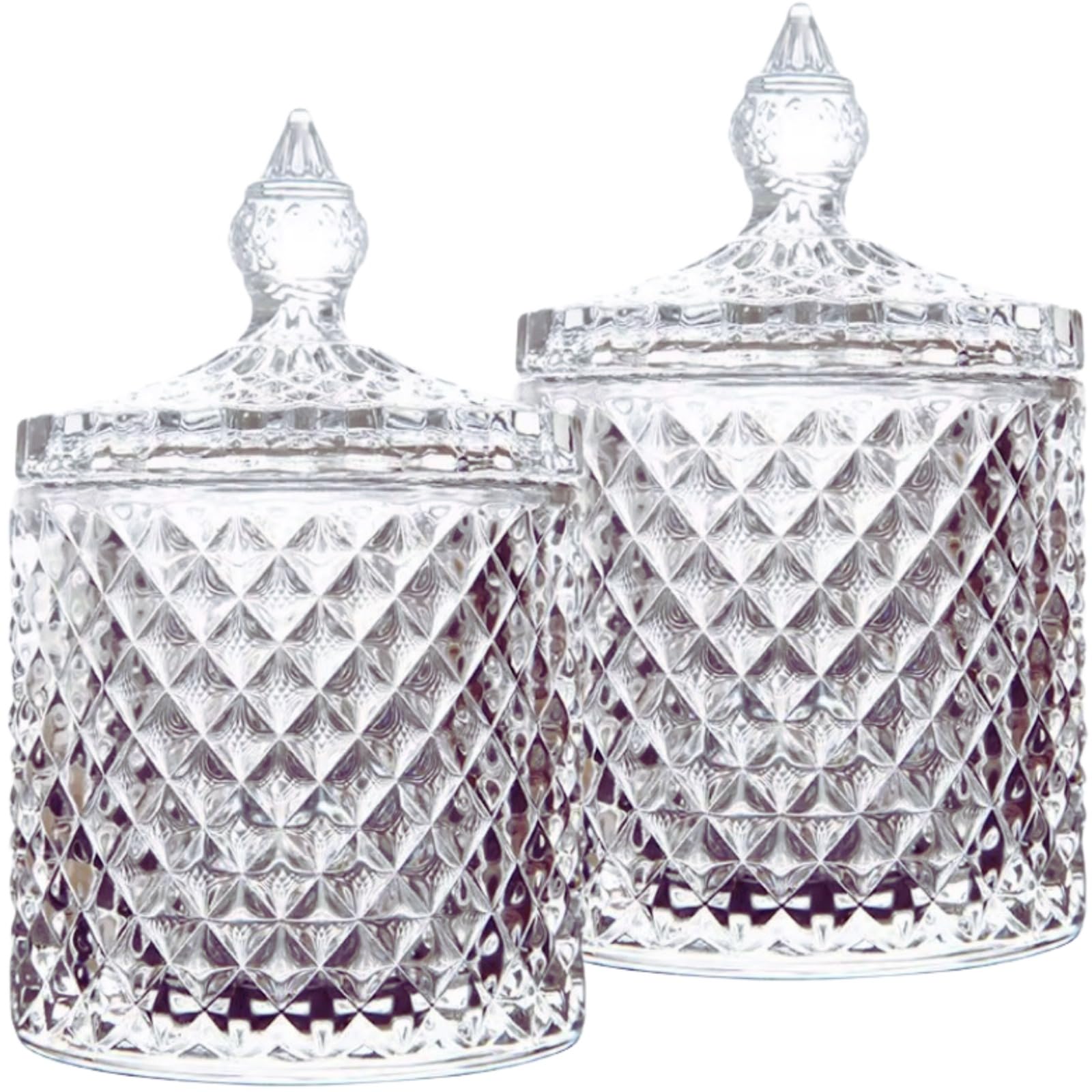 - UNIQUE DIAMOND DESIGN CRYSTAL GLASS STORAGE JARS WITH LIDS: Our set of 2 clear glass jars with lids, bathroom decor set have diamond faceted. Diamond cuts make cotton pad storage shiny which make bathroom look cool. Bathroom jars with lid, cotton pads holder, glass bathroom accessories is designed with clean lines and lid. Cotton pad dispenser, glass jar, bathroom containers is the best as bedroom decor, bathroom decor, vanity decor, home decor.