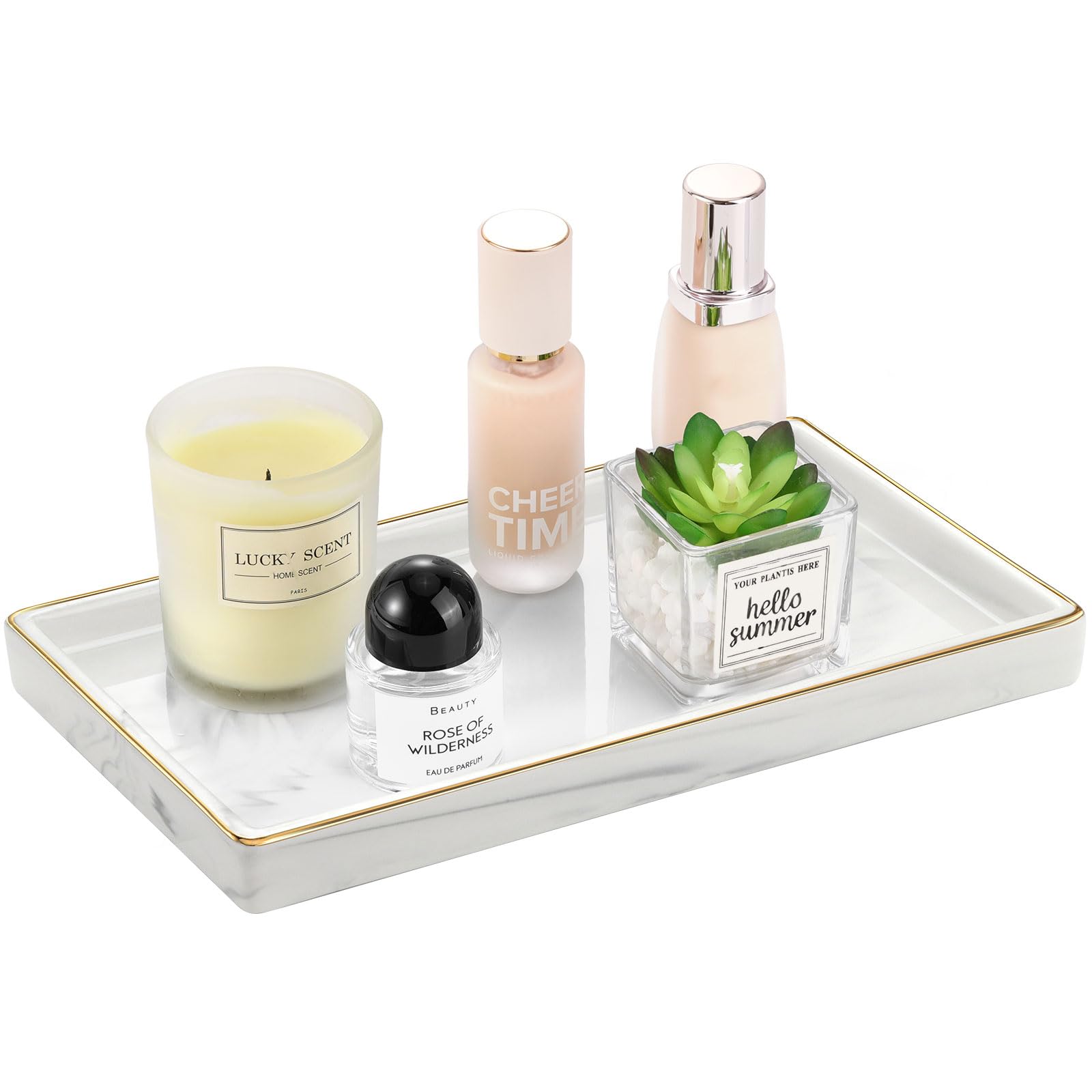 - 【Multi-purpose use】: It can work as a display tray for perfume, shampoo, toothbrushes, lotion bottles, cosmetics, ornaments and other vanity essentials; even a serving tray for food drinks and coffee. You can display this tray on your dresser, toilet tank, bedside table, linen closet, vanity countertop, in your bathroom, kitchen, balcony to display your lovely tiny planter pots, in the office to store pens stationery, ect.