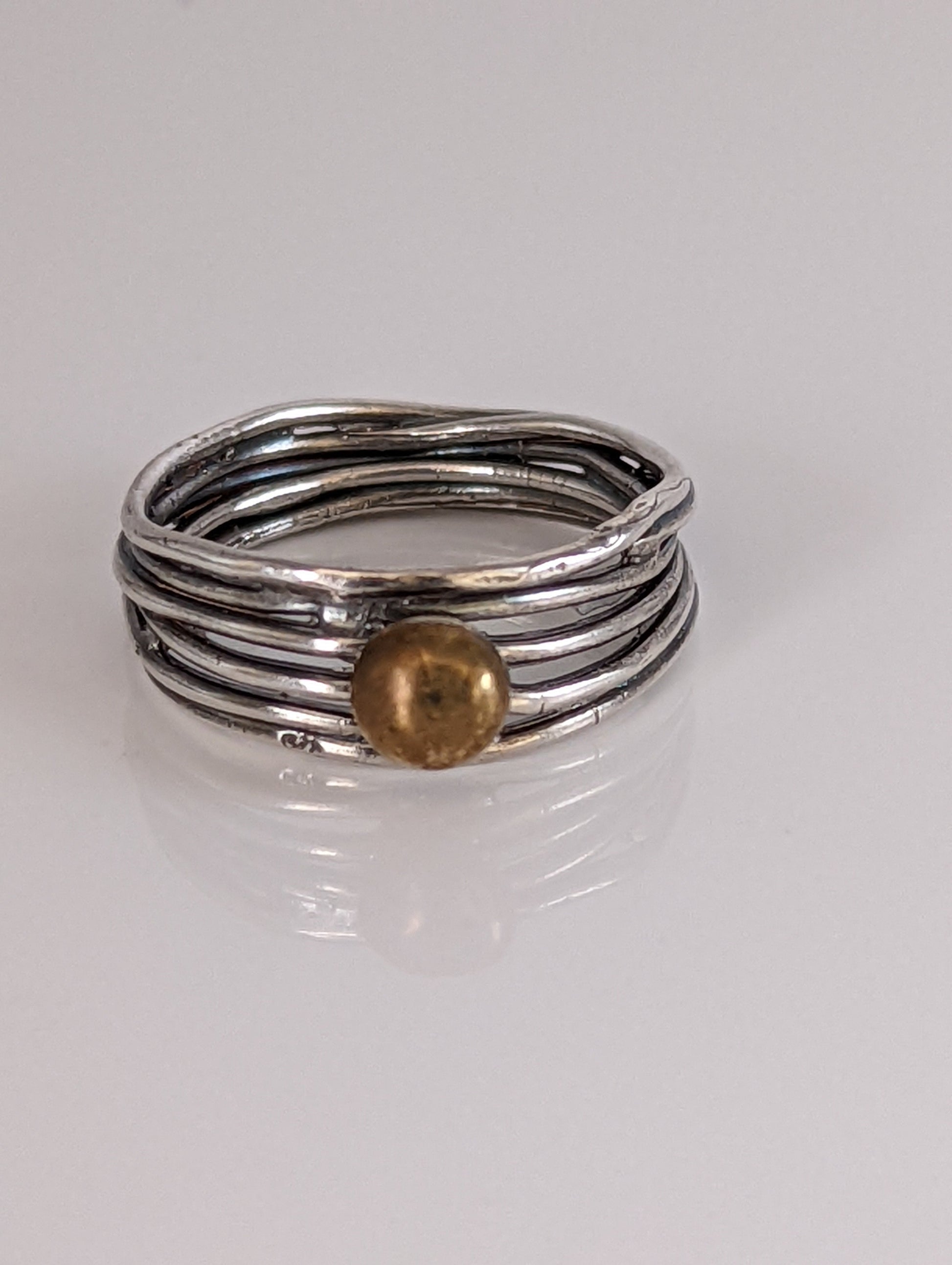 This beautiful hand-made silver ring looks like wires with a beautiful accent of the brass ball.